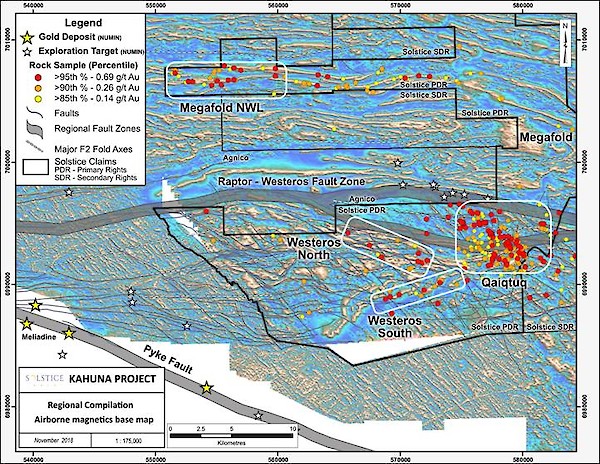 Figure 1: Regional compilation of the Kahuna project. Base map is RTP (Reduced to Pole) shaded airborne magnetic data. Data outside Solstice claims are derived from assessment files, and GSC open files 6606 & 6616. Gold data and structural interpretation is by Solstice. Gold deposits and exploration targets are from the Nunavut Minerals (NUMIN) database.