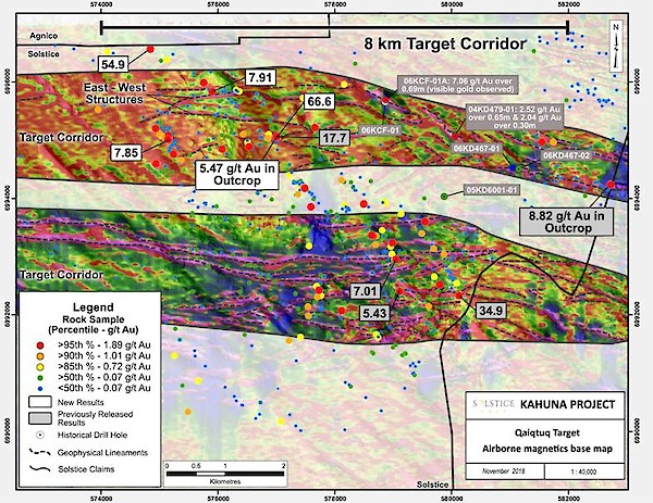 Vancouver (November 13, 2018) Solstice Gold Corp. (TSXV: SGC) (“Solstice”, the “Company”, “we” or “our”) is pleased to provide updated results from the summer, 2018 work program at its 100% owned 920 km2 Kahuna Gold Project (“Kahuna” or the “Project”), located near Rankin Inlet, Nunavut. The objectives of the 2018 program were to identify targets for potential drill follow up and also to prospect under-explored parts of the large project area.