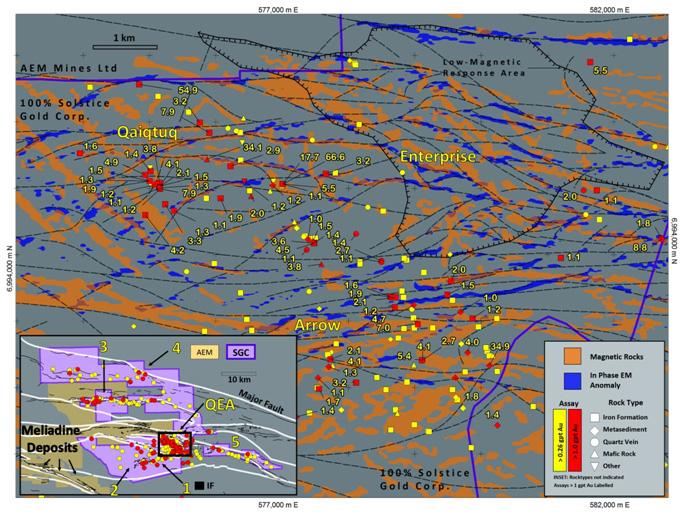 “The Meliadine and other regional gold deposits are marked by large boulder trains which led to their original discovery. As well, they have an EM response as do similar sulphide-associated gold deposits of this deposit type elsewhere. Similarly, the components present at QEA suggest the presence of a large mineralizing system: an extensive gold-bearing boulder field, mapped structures, iron formations and EM conductors” stated David Adamson, Chairman.