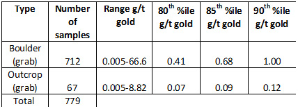 Table 1: Summary statistics of gold samples from Boulder and Outcrop grabs from the QEA.