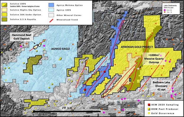 Solstice identified the Hammond Gold Camp as an emerging gold district because it is has demonstrated prospectivity beyond Agnico Eagle’s Hammond Reef gold deposit. In recent years, new discoveries, and data, including our own field-based due diligence in 2020, confirm the presence of multiple, prospective mineralized structures in similar host rocks.